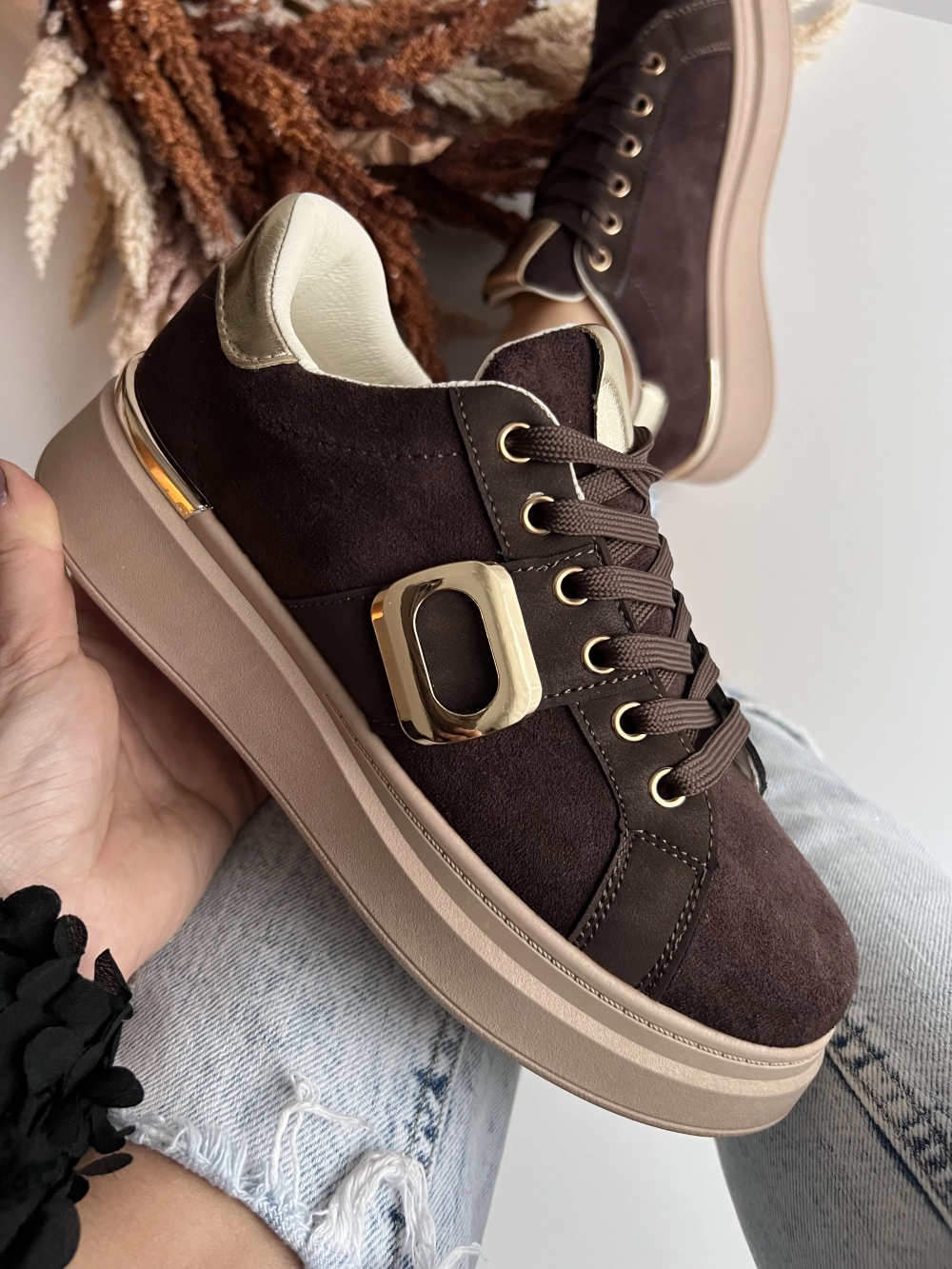 Sisetalla pikkus (cm) 36/23.5cm, 37/24cm, 38/24.5cm, 39/25cm, 40/25.5cm, 41/26cm. Keskmise liistuga. Materjal: kunstnahk. Värvid: pruun ja kuldne.